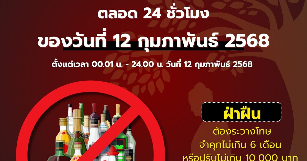 กองสารนิเทศ สำนักงานตำรวจแห่งชาติ ขอย้ำเตือนร้านค้าและผู้ประกอบการให้งดขายเครื่องดื่มแอลกอฮอล์ทุกชนิด ทั้งชนิดขายส่งและขายปลีกทั่วราชอาณาจักร ตลอด 24 ชั่วโมง ตั้งแต่ 00.01 – 24.00 น. ของวันที่ 12 กุมภาพันธ์ 2568 (ยกเว้นการขายเฉพาะร้านค้าปลอดอากรภายในอาคารท่าอากาศยานนานาชาติ) หากฝ่าฝืนมีความผิดตามมาตรา 39 แห่ง พ.ร.บ.ควบคุมเครื่องดื่มแอลกอฮอล์ พ.ศ.2551