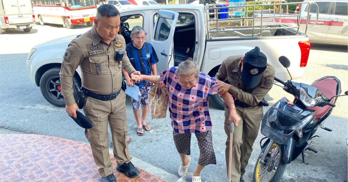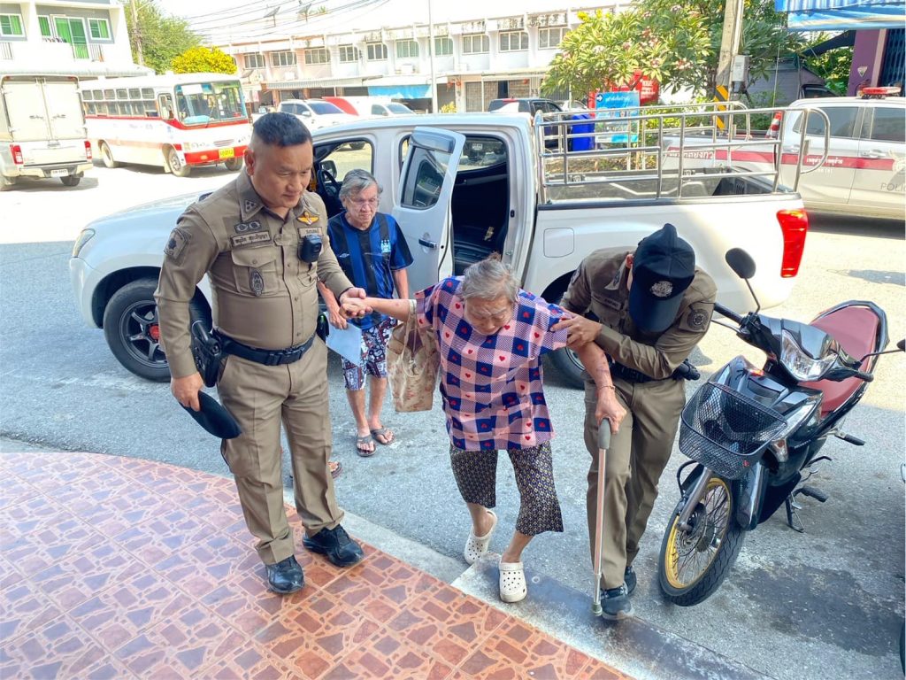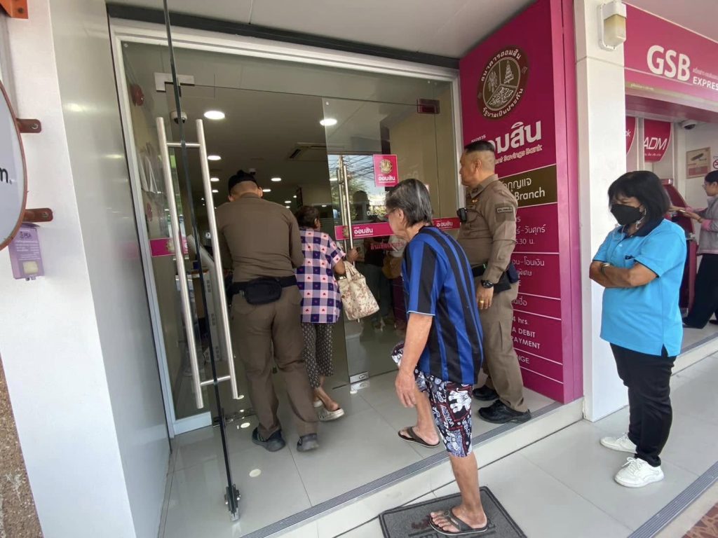 เจ้าหน้าที่ตำรวจสายตรวจ ให้การช่วยเหลือผู้สูงอายุมาใช้บริการธนาคารออมสิน