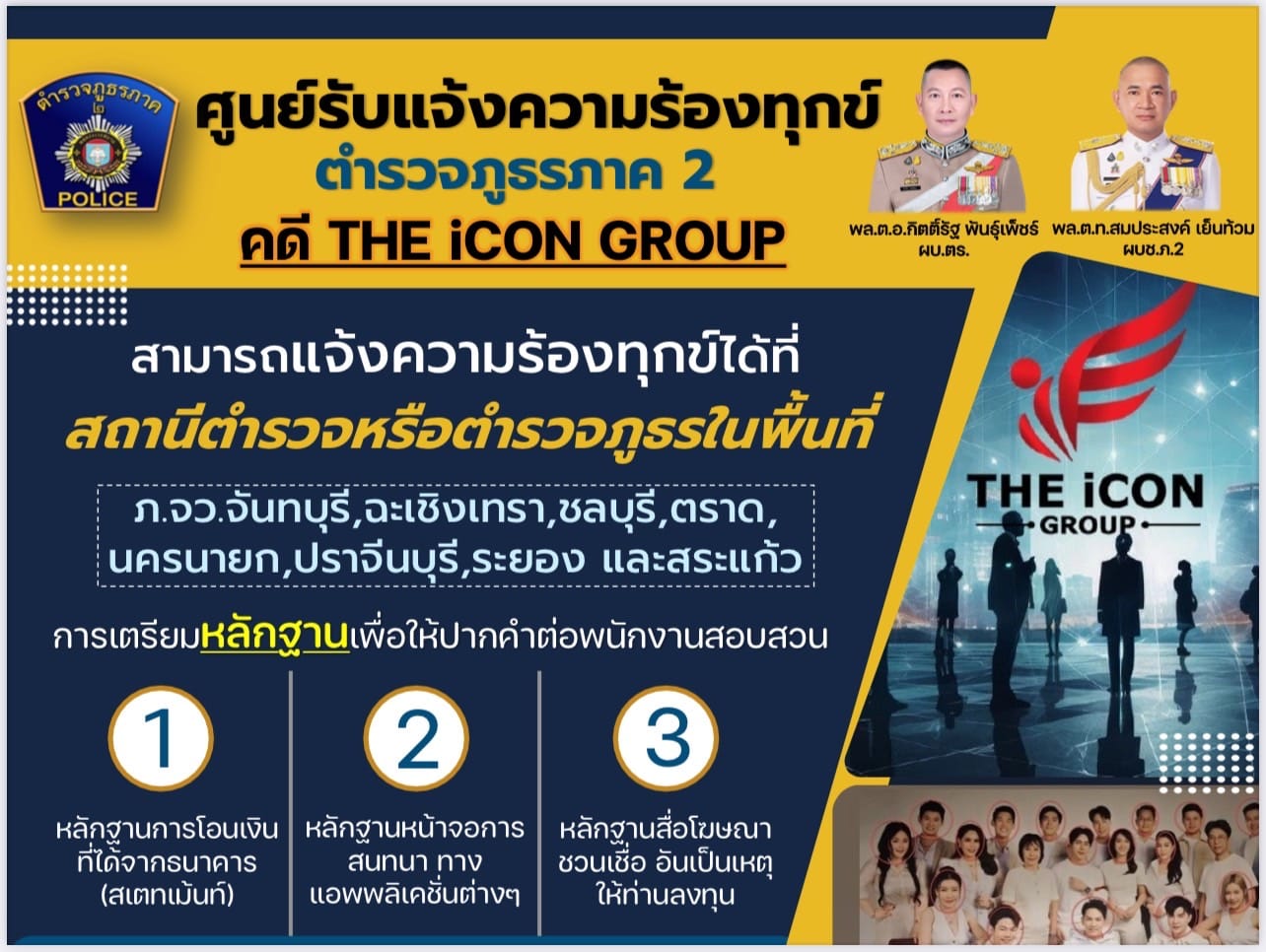 หากท่านใดได้รับความเสียหายจากคดี The icon group สามารถแจ้งความร้องทุกข์ได้ที่ “สถานีตำรวจในทุก